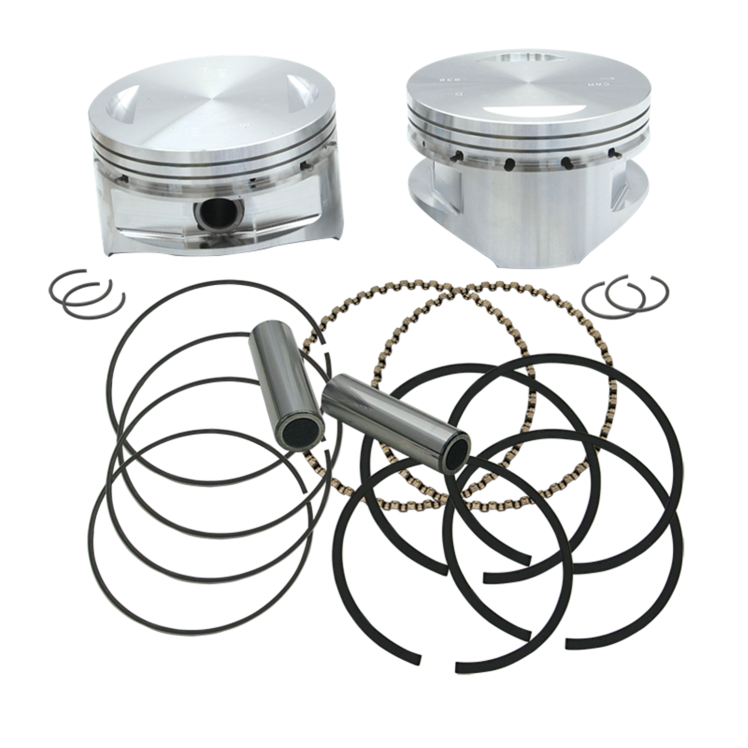 S&S replacement piston kits for use in S&S 96CI V2, 113CI SuperSideWinder, and 124CI SuperSideWinder Plus engines, as well as many S&S and other aftermarket Stroker and Big Bore kits. Kits contain 2 forged pistons, piston rings, wrist pin and clips. Ring sets are also available separately.