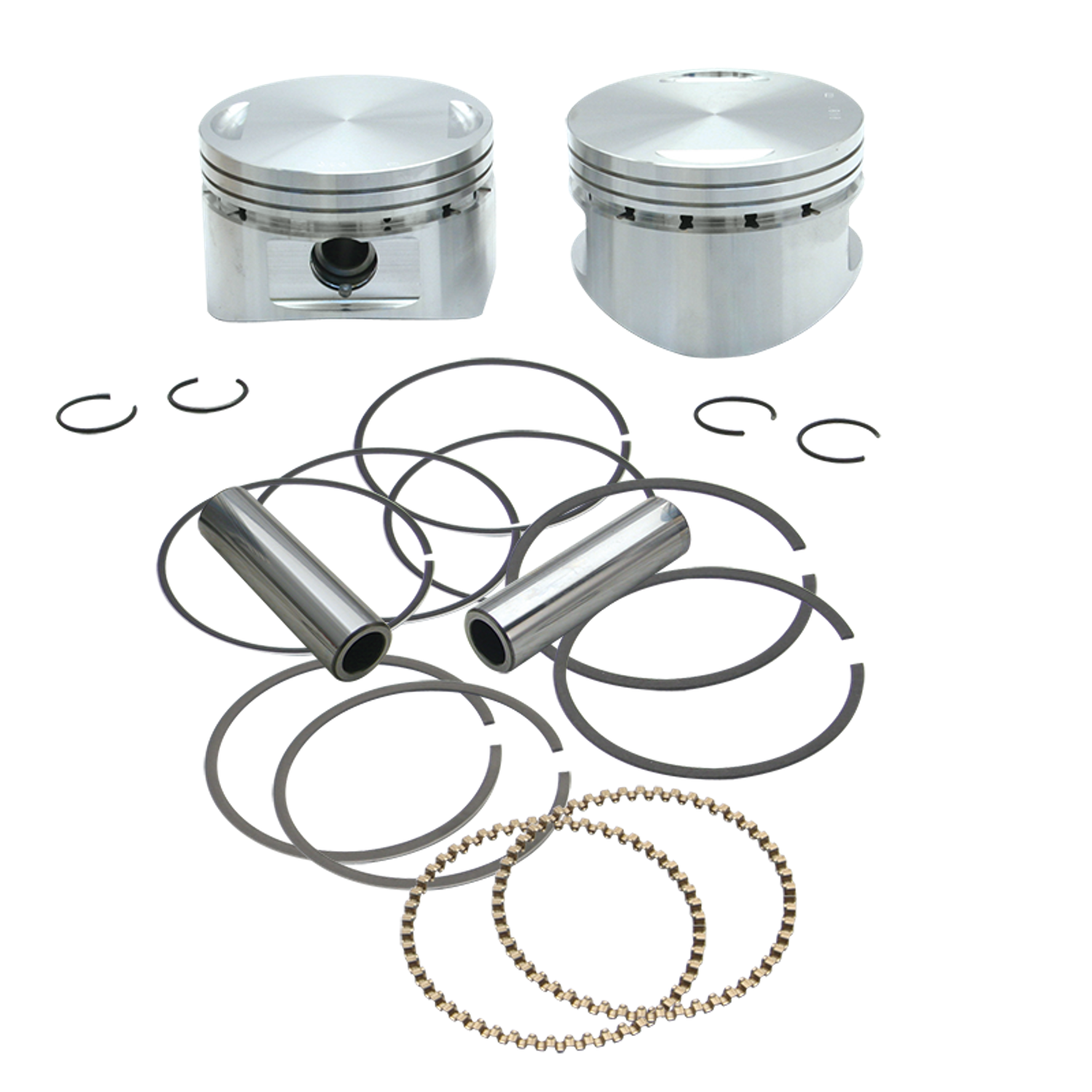 S&S replacement piston kits for use in S&S 96CI V2, 113CI SuperSideWinder, and 124CI SuperSideWinder Plus engines, as well as many S&S and other aftermarket Stroker and Big Bore kits. Kits contain 2 forged pistons, piston rings, wrist pin and clips. Ring sets are also available separately.