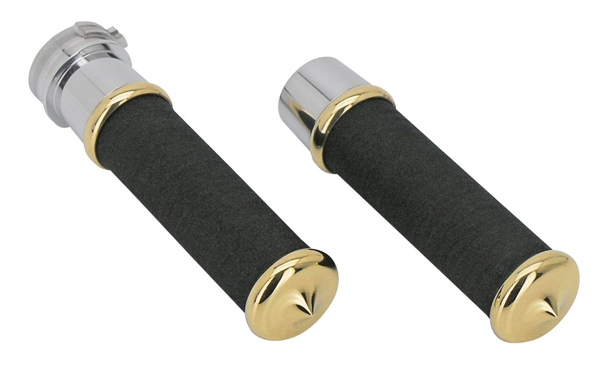 Nostalgic looking handlebar grips covered with fabric tape. Made from billet aluminum featuring a polished finish and come with polished brass end caps. Fits most single and dual cable applications. Sold in sets of left and right.