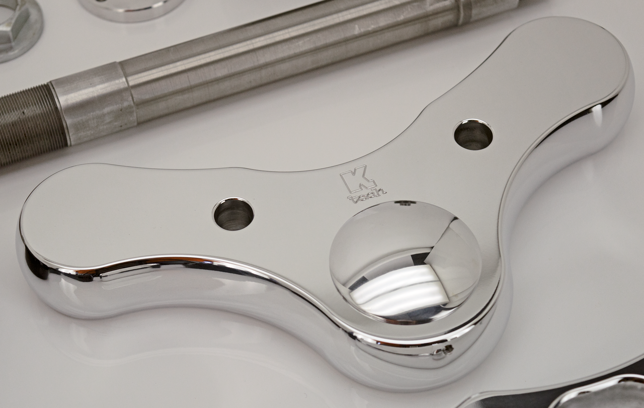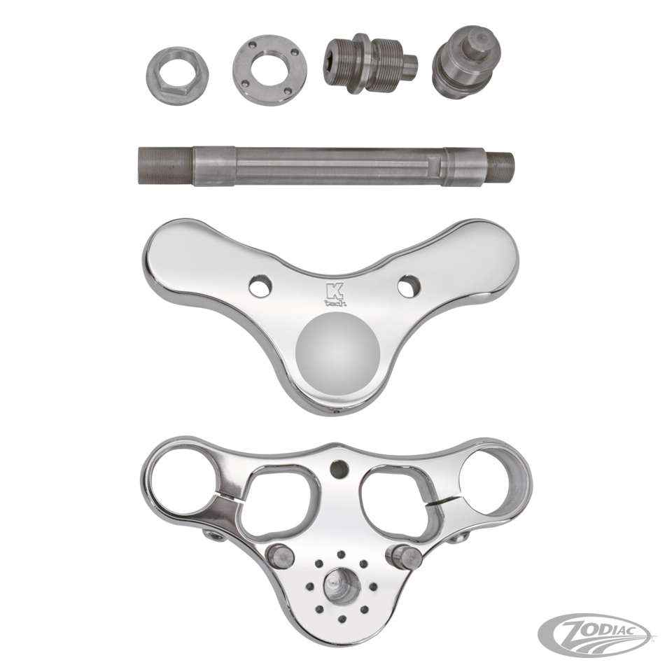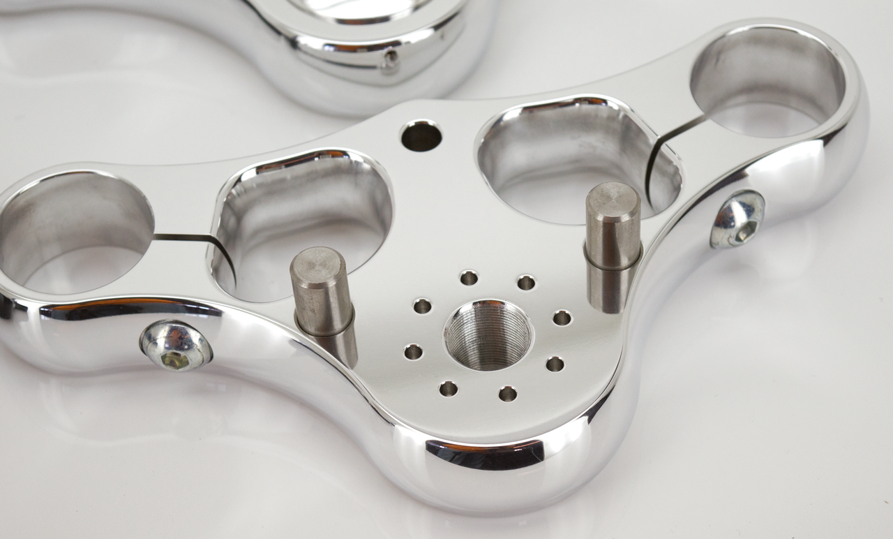 These billet aluminum triple trees are CNC machined and feature hidden fork tube caps and hidden steer stops for a very clean custom look. Take stock and stock style 39mm fork tubes as used in 1987 to present Sportster, 1987-1994 FXR and 1991-2005 Dyna. Installation does not require any frame modifications.