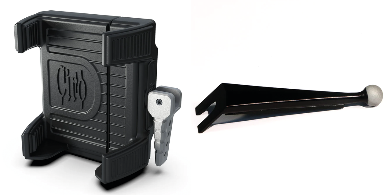 These accessories allows you to mount your phone or camera to any Ciro ball stud. Has bolt patterns and stud mounts for most common phone and camera mounts. When you do not want to worry about draining your phone battery while riding again, we suggest the Ciro Premium Smartphone mount with its built in 1.3 amp USB plug, so you can charge as you ride using the USB cable from your device. The CyberCharger is best for you when you have a Smartphone that supports wireless charging. Mk II CyberChargers feature a slim arm design that allows additional clearance for the buttons on certain models of smartphones. An upgrade kit to change a Mk I into Mk II is also available. The Budget and Premium holders fit devices from 2 1/8" to 3 1/2" (54 to 89mm) wide, the CyberCharger takes devices from 2 3/8" to 4" (60 to 102mm) wide. For action cameras we have a specific adapter available.
