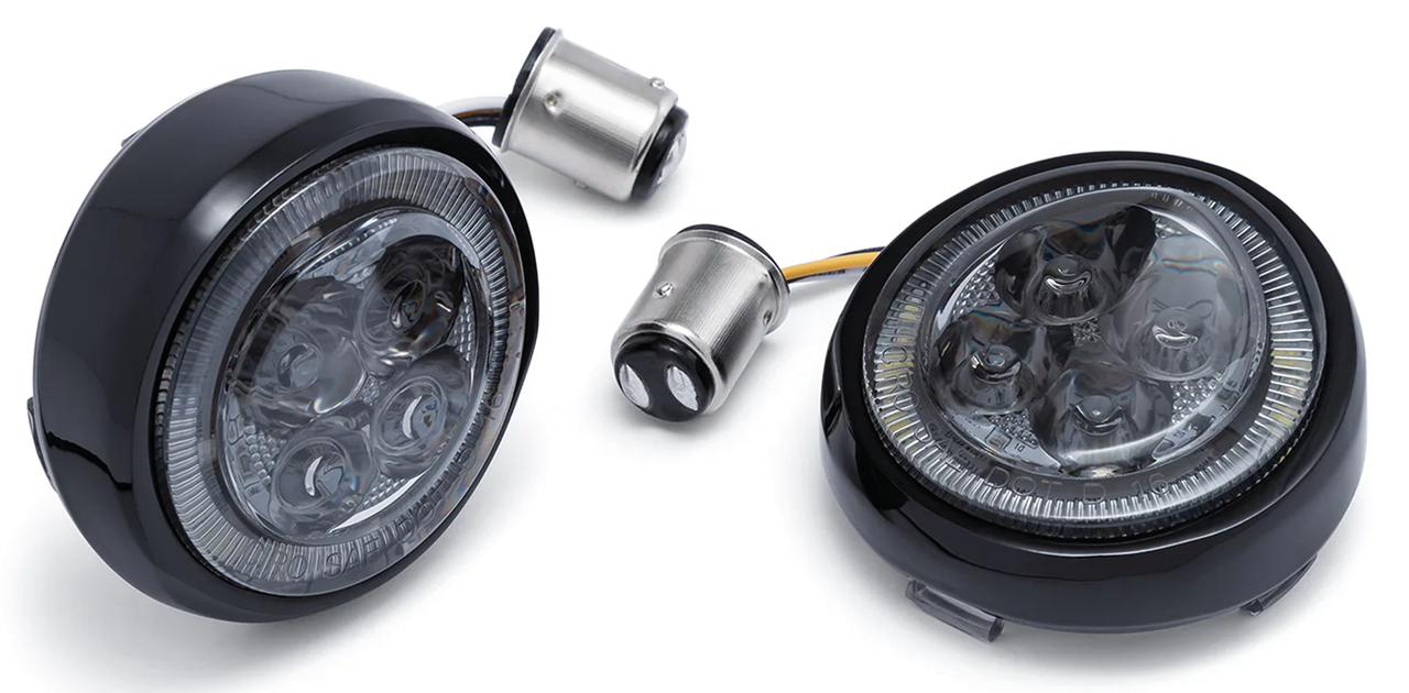 The Fang turn signal light inserts fit straight into OEM bullet style turn signals and are a great way to add modern styling and class to your bike while also increasing visibility. Ciro has engineered the lenses to amplify light output for maximum brightness. A Load Equalizer is required for 2002-2013 Sportster, 2000-2010 Softail, 2009-2011 Dyna and 2010-2013 Touring. All lights are sold in sets of 2 for left and right and are DOT approved.