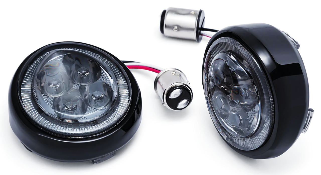 The Fang turn signal light inserts fit straight into OEM bullet style turn signals and are a great way to add modern styling and class to your bike while also increasing visibility. Ciro has engineered the lenses to amplify light output for maximum brightness. A Load Equalizer is required for 2002-2013 Sportster, 2000-2010 Softail, 2009-2011 Dyna and 2010-2013 Touring. All lights are sold in sets of 2 for left and right and are DOT approved.