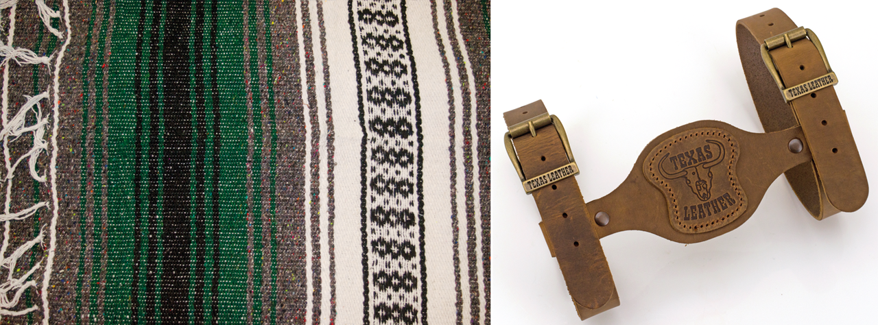 Authentic Made in Mexico sarapes, serapes, saltillos or Mexican blankets. Cozumel style blankets are made of an Acrylic with cotton and polyester blend, measuring 59"x84" (150x213cm). Veracruz style blankets are 100% Acrylic and measure 52"x80" (132x203cm). Available with or without Genuine Leather blanket holder that you can tie to your handlebars, sissy bar or you name it. Blanket holders have straps with 22" (56cm) useable length and can also be used for sleeping bags.