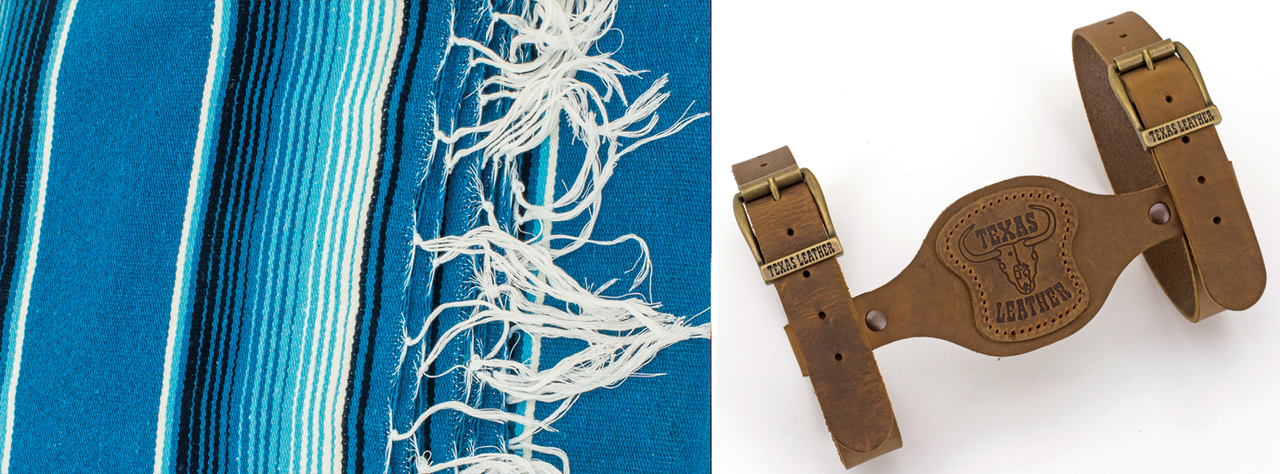Authentic Made in Mexico sarapes, serapes, saltillos or Mexican blankets. Cozumel style blankets are made of an Acrylic with cotton and polyester blend, measuring 59"x84" (150x213cm). Veracruz style blankets are 100% Acrylic and measure 52"x80" (132x203cm). Available with or without Genuine Leather blanket holder that you can tie to your handlebars, sissy bar or you name it. Blanket holders have straps with 22" (56cm) useable length and can also be used for sleeping bags.