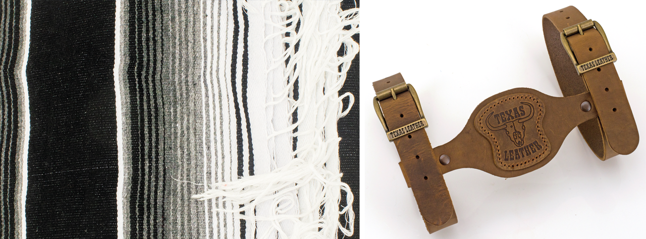 Authentic Made in Mexico sarapes, serapes, saltillos or Mexican blankets. Cozumel style blankets are made of an Acrylic with cotton and polyester blend, measuring 59"x84" (150x213cm). Veracruz style blankets are 100% Acrylic and measure 52"x80" (132x203cm). Available with or without Genuine Leather blanket holder that you can tie to your handlebars, sissy bar or you name it. Blanket holders have straps with 22" (56cm) useable length and can also be used for sleeping bags.
