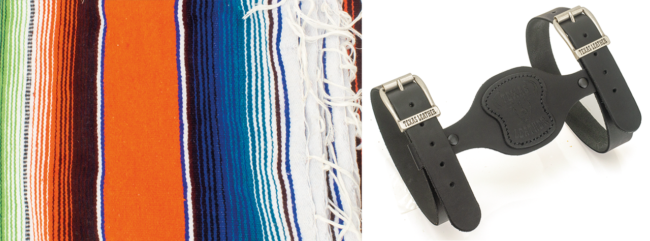 Authentic Made in Mexico sarapes, serapes, saltillos or Mexican blankets. Cozumel style blankets are made of an Acrylic with cotton and polyester blend, measuring 59"x84" (150x213cm). Veracruz style blankets are 100% Acrylic and measure 52"x80" (132x203cm). Available with or without Genuine Leather blanket holder that you can tie to your handlebars, sissy bar or you name it. Blanket holders have straps with 22" (56cm) useable length and can also be used for sleeping bags.