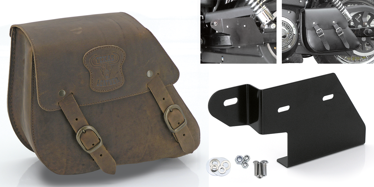 Available in plain black and fit all Dyna and Dyna Wide Glide 1991-2017. Available for the left side only as a right side bag would interfere with your exhausts. Complete kit contains a black or Ranger brown leather bag and an easy to bolt-on mounting bracket, with hardware.