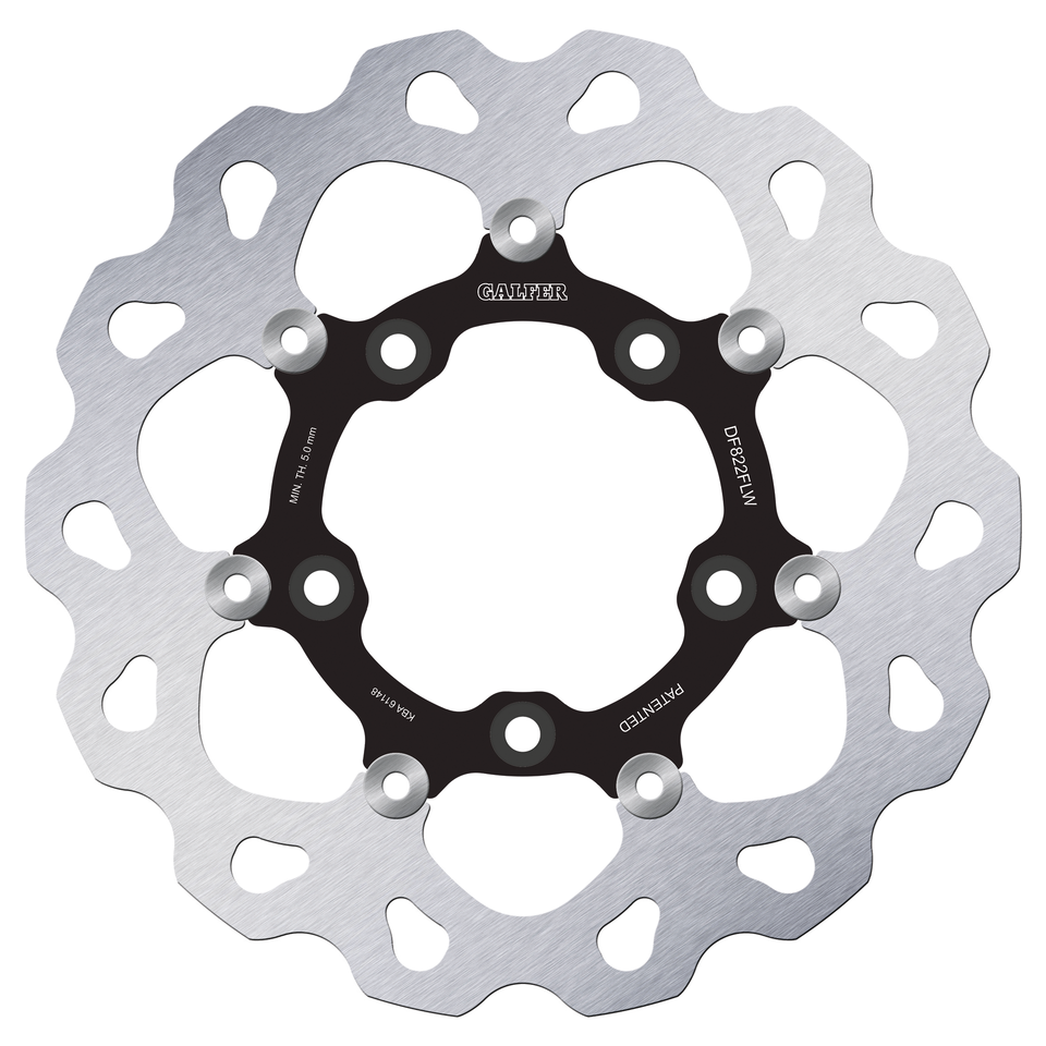 Galfer brake discs for use with stock and stock-replacement calipers. Full floating discs have stainless steel outer bands with black coated steel centers, held by and clear stainless floating elements. As with every brake disc it is strongly recommended to install new brake pads with a new brake disc.
