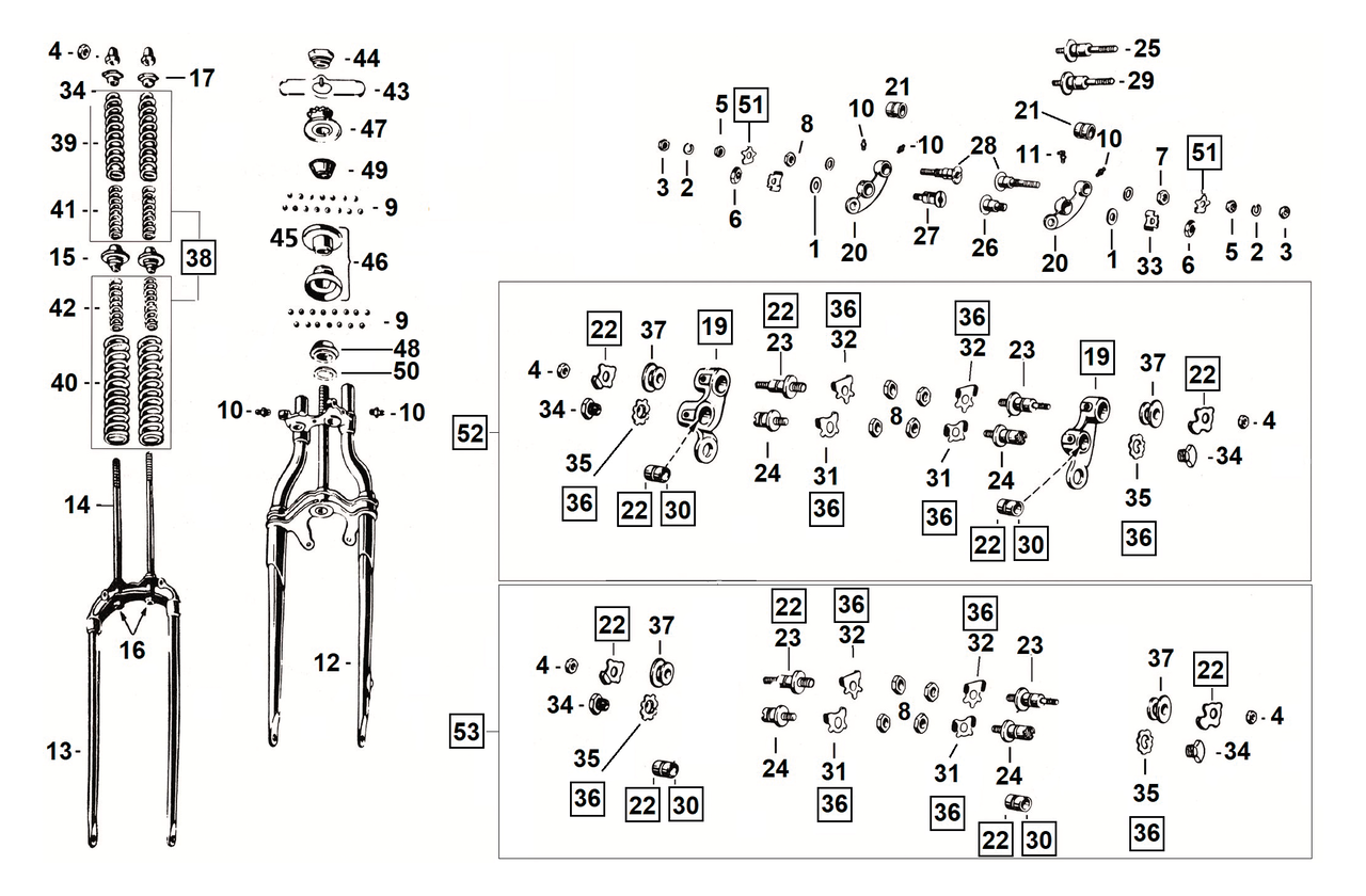 Parts fit Springer forks in most 1930 thru 1952 45CI Solo, 1941 thru 1957 Servi-Cars and 1941 thru 1948 Big Twin as indicated below. Unless indicated differently all are sold each.