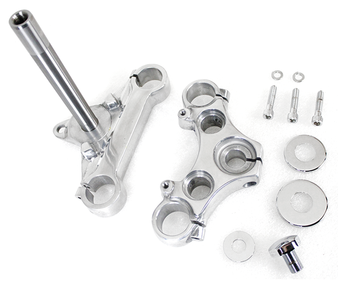 The lower trees in these kits are made as stock replacement in models produced for the US Domestic Market. Use in models produced for Europe may require drilling the hole for the Neimann style steering lock and/or cutting off the ear for the USA model padlock type steering lock. There is no difference between upper trees for US Domestic and European models. All kits include one fork top plate and a lower fork bracket, also known as lower fork tree or lower fork yoke.