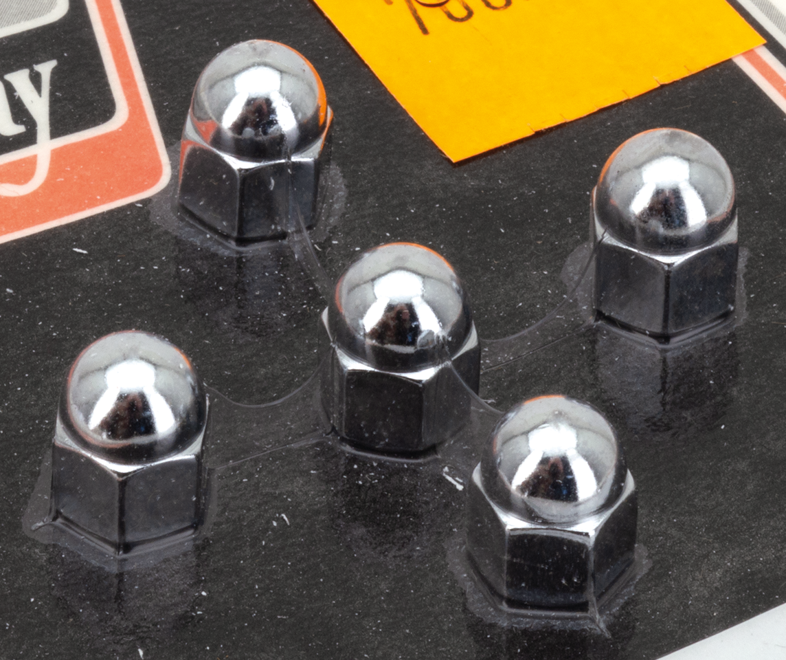 Colony's own style of the well known acorn nut has a round domed top. Perfectly chrome plated and supplied in blister packs.