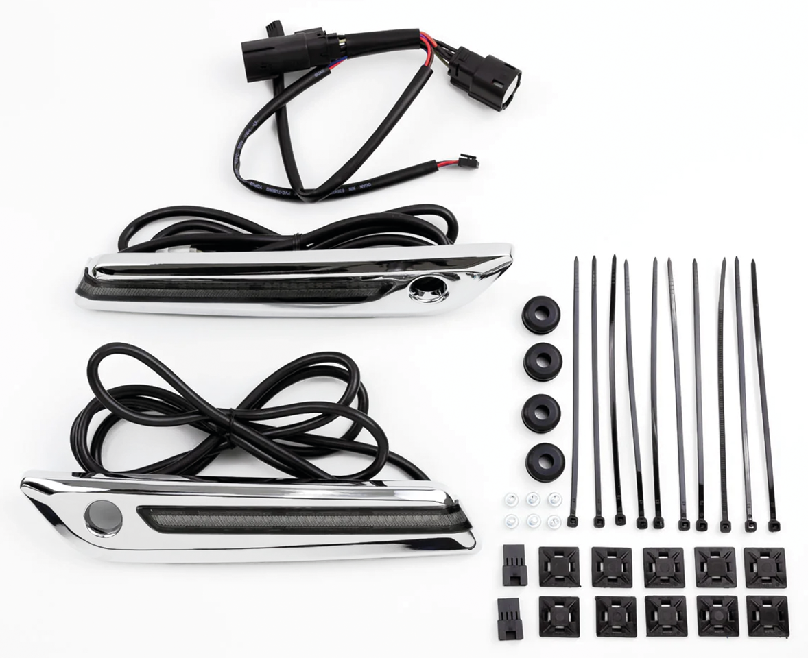 Ciro streamlined the look of a lighted alternative for your OEM hinge covers and reflectors to transform the look of your saddlebags. Available with a light smoke or red lens, featuring red run and brake lights plus animated red turn signals. They come with quick disconnect, plug-n-play harness for easy saddlebag removal.