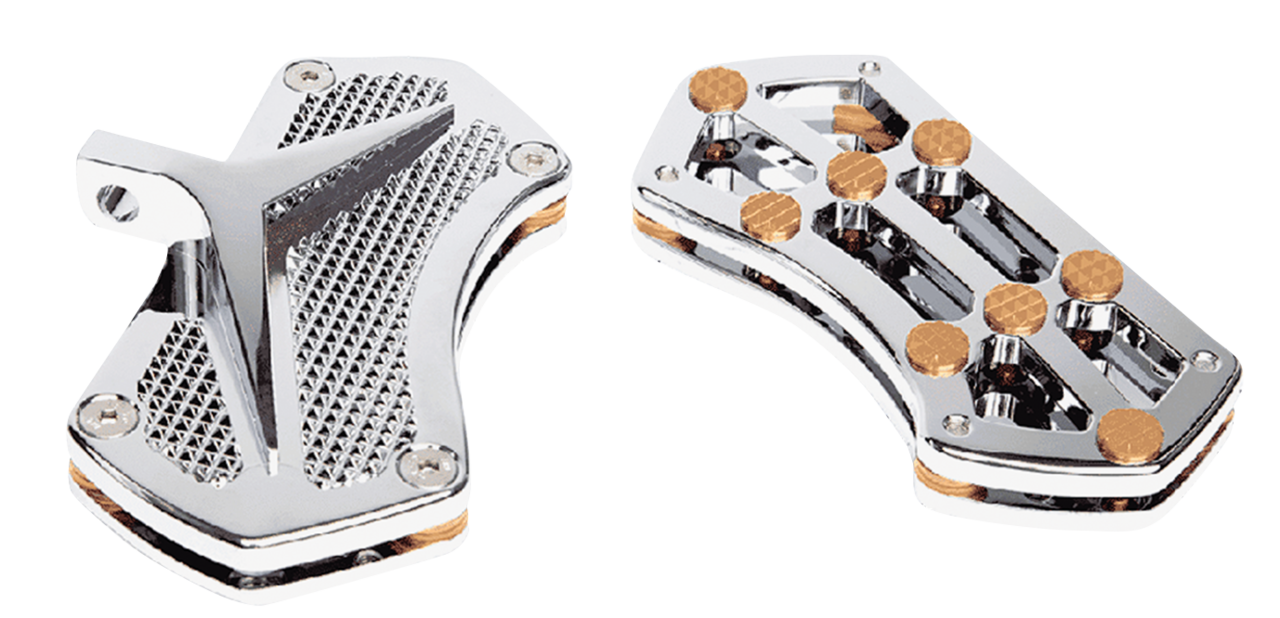 Billet aluminum. Driver boards are 13.8" (35 cm) long and 5" (12.7 cm) wide. Feature 18 Diamond style inserts for maximum traction. Driver boards fit the stock mounts. Passenger boards fit the stock passenger peg mounts on Street Glide and other models with vertical folding female mounts. For all Touring models except Street Glide you have to order Vity's passenger board mounts separately. Boards and mounts are sold in pairs. Vity's Design is Italian, reason why they offer red and green from their flag or blue from their sports outfits as an accent color.