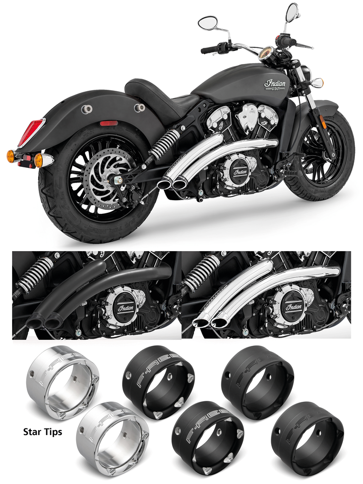 Freedom Performance Radical Radius exhausts feature one piece 2 1/2" (64mm) outer diameter 16 gauge heavy duty heat shields that cover the headers for a full 220 degrees and they have a three-step header system for optimal horsepower and torque. The curved mufflers give an aggressive deep growl. Baffles are removable, and a quiet baffle kit is available as an accessory. These exhausts come complete and ready to bolt on and include stainless steel hardware and brackets.