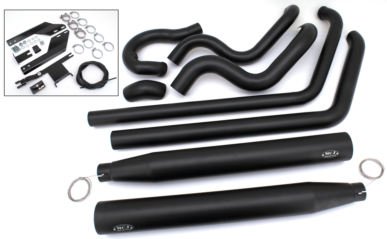 Complete 2-into-2 exhaust system with E-approved mufflers that feature adjustable exhaust valves that allow you to tune the sound of your bike the way you like it, but still get back to what is legal. The front pipe exits to the right and the rear pipe is a cross-over to the left. These exhaust systems come complete with a manual operated adjusting lever that can be placed on either the handlebar or below the tank. Electric operated adjusting motors with a key fob style remote control are available as an option. Muffler end caps must be ordered separately.