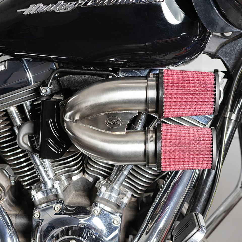 The S&S single bore tuned induction system is cool looking and delivers a healthy boost in midrange torque. Peak horsepower is also increased. The tuned runner system makes even more horsepower than an S&S teardrop air cleaner. Performance increases are across the board for stock and big inch engines alike. The heart of the single bore tuned induction system is the dual runner, two-into-one intake. The tuned runners are very similar in appearance to the dual runner intake for our dual bore induction system, but the design allows for more flexibility. Instead of bolting directly to a throttle body, the runners of the single bore induction join together in a smooth, flow enhancing curve and the unit bolts to an adapter bracket. The Tuned Induction System will not fit on motorcycles equipped with fairing lower glove boxes or Twin-Cooled models.
