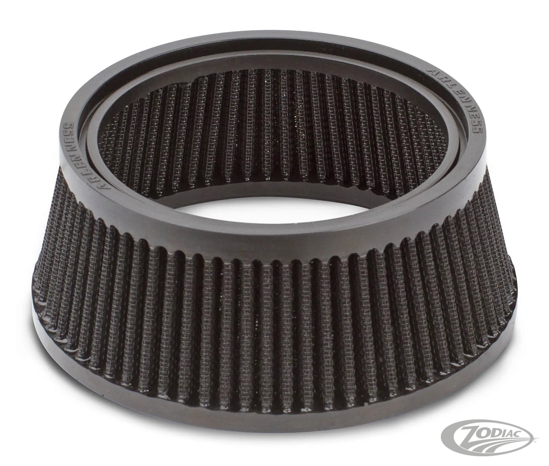 Forged billet air cleaner that increases horsepower and torque, while allowing you to view the internal workings of your intake system. Filter housing is made from a single piece of forged billet aluminum for a clean style, superior durability and improved ergonomics, and features a clear polycarbonate top with coating to prevent yellowing and damage associated with UV light or oil exposure. Also features Ness Big Sucker hidden breather technology and radius air inlet. The air filter element itself is made from black pre-oiled cotton and is washable and thus reusable.