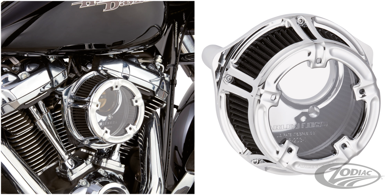 Forged billet air cleaner that increases horsepower and torque, while allowing you to view the internal workings of your intake system. Filter housing is made from a single piece of forged billet aluminum for a clean style, superior durability and improved ergonomics, and features a clear polycarbonate top with coating to prevent yellowing and damage associated with UV light or oil exposure. Also features Ness Big Sucker hidden breather technology and radius air inlet. The air filter element itself is made from black pre-oiled cotton and is washable and thus reusable.