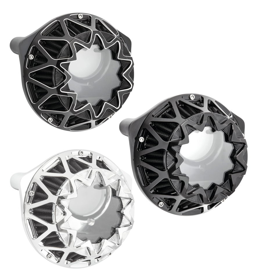 Air cleaners with Arlen's next generation patented inverted backing plates with hidden breather design and a polycarbonate top. The ergonomic design improves legroom. Intakes come complete with a black pre-oiled High Performance filter element.