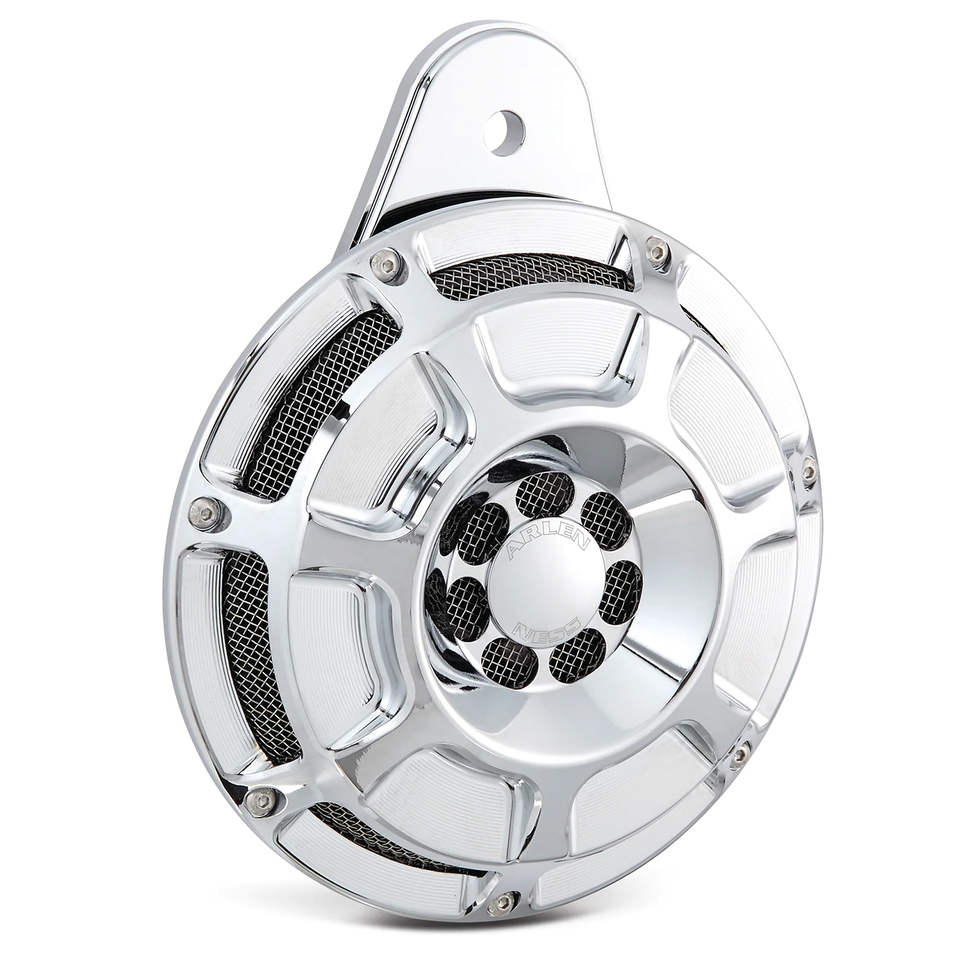 Complete horn kits made from forged billet aluminum and stainless steel mesh. Great styling, but also compact in size to allow for leg clearance. Available in 4 different models in chrome or black anodized, with steel brackets for Sportsters and steel brackets for the universal applications, which are great for Customs, Softail and Dyna models. These powerful horns are easy to install and capable of a noise level of 110dB(a), making sure you are heard when you want to be. Looks great with a matching Arlen Ness Inverted Air Cleaner kit.